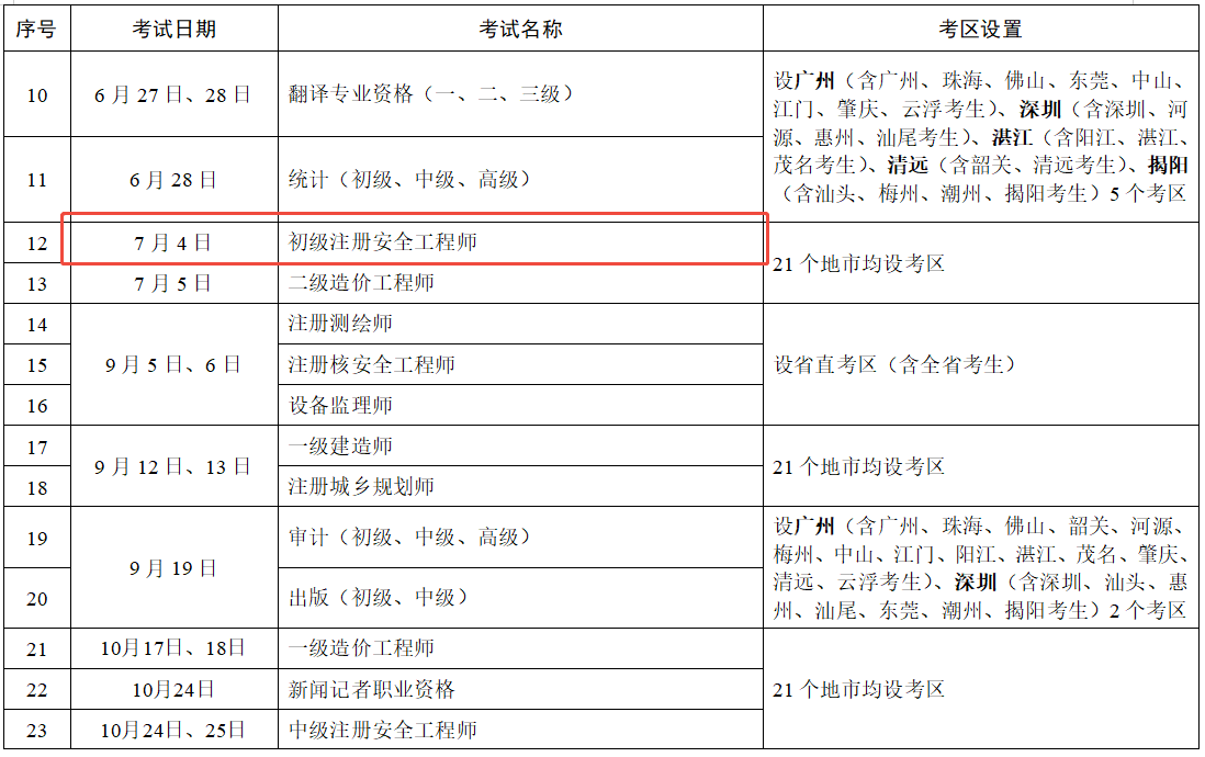 广东人事考试网发布《2026年度专业技术人员职业资格考试工作计划及有关事项的通知》,2026年广东初级注册安全工程师资格考试时间7月4日。