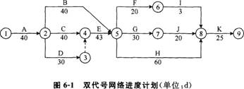 1、某工程施工合同工期为213 d,施工单位拟订的施工双代号网络进度计划如图6-1所示,图中箭线下方数据为工作持续时间。