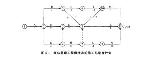 2、某市政工程,项目的合同工期为38周。经总监理工程师批准的施工总进度计划如图6-1所示(时间单位:周),各工作可以缩短的时间及增加的赶工费见表6-1,其中H、I分别为道路的路基、路面工程。