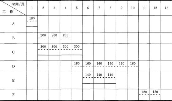 1、某工程按最早开始时间安排的横道图计划见表5-1,虚线上方数字为该工作每月的计划投资额(单位:万元)。该工程施工合同规定,工程于1月1日开工,按季度综合调价系数调价。在施工过程中,各工作的实际工程量和持续时间均与计划相同。