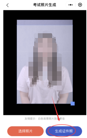 ③点击选择——相册上传/直接拍摄——点击“生成证件照”(此时照片已生成正确的尺寸和像素)。
