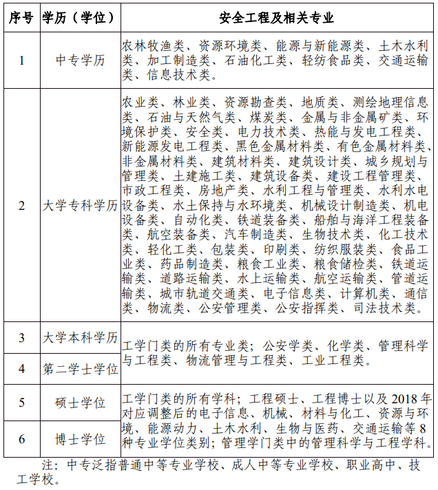 1、具有安全工程及相关专业大学专科学历,从事安全生产业务满5年;或具有其他专业大学专科学历,从事安全生产业务满6年。