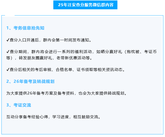 25年注安成绩将于12月最后一周公布!233网校会一直关注官方平台发布情况,一旦成绩公布,马上在查分交流群第一时间发布通知。