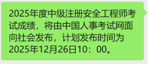 今天(12月23日)注安学习群里,很多考生都在疯传,2025年中级注册安全工程师考试成绩计划发布时间为2025年12月26日10:00。