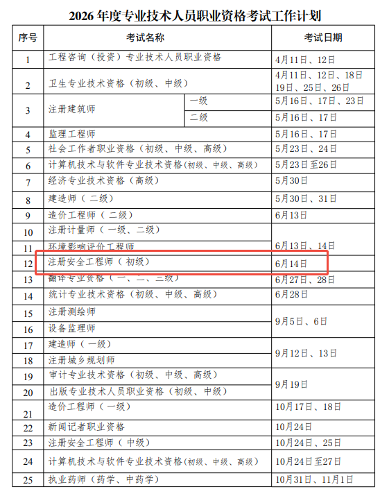 宁夏人事考试中心发布《2026年度专业技术人员资格考试工作计划》,2026年宁夏初级注册安全工程师考试时间为6月14日。