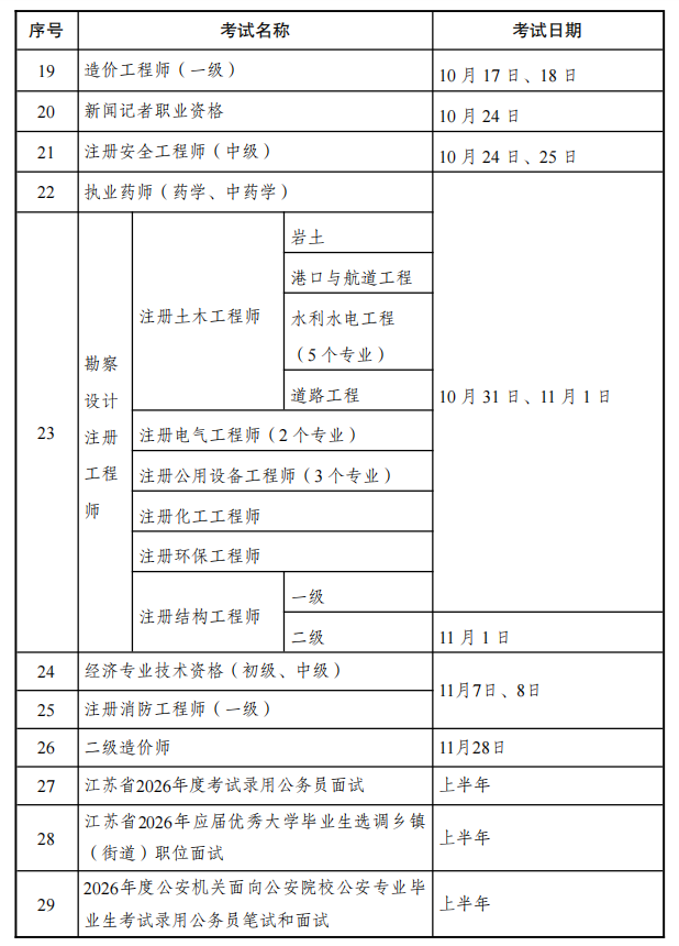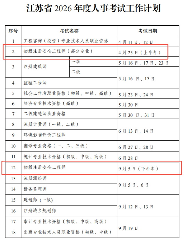 江苏省人力资源和社会保障局发布《江苏省2026年度人事考试工作计划》,2026年江苏初级注册安全工程师职业资格考试时间4月25日(部分专业)、9月5日。