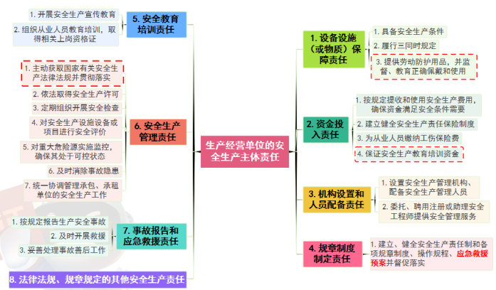 (6)安全生产管理责任。包括主动获取国家有关安全生产法律法规并贯彻落实;依法取得安全生产许可;定期组织开展安全检查;依法对安全生产设施、设备或项目进行安全评价;依法对重大危险源实施监控,确保其处于可控状态;及时消除事故隐患;统一协调管理承包、承租单位的安全生产工作。