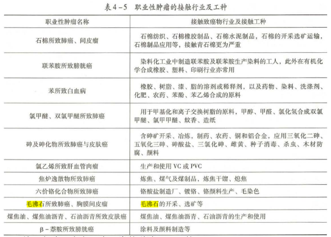 本题考察的知识点是职业性肿瘤的接触行业及工种表4-5 毛沸石所致肺癌。故本题C选项正确,选项ABD错误。
