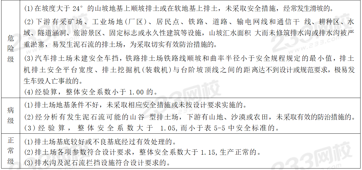 10、排土场安全度分类,主要根据排土场的高度、排土场地形、排土场地基软弱层厚度和排土场稳定性确定。安全度分为危险、病级和正常。下列各类排土场中,可判定为危险的是( )。
