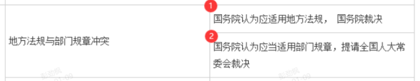 地方性法规与部门规章 | 国务院提意见 | 国务院认为用地方性法规的,国务院裁决 | ||||