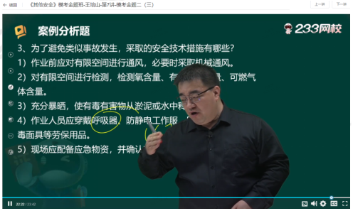 3、案例主观题的话也是延续以往风格,涉及了各行各业,但是25年的考查内容还是在老师的掌握之中,比如案例一的重大事故隐患判定、防静电安全技术措施、直接原因分析,防火防爆作业要求都是老师课中重点强调的内容,考前课程中更是重点强调了的;案例二考查的是有限空间相关内容,王培山老师模考金题班有一道案例题基本覆盖考查的全部内容了,案例三考查的个体防护装备、根据GB 6441进行危险有害因素的辨识,应急处置措施也是老师课中重点强调的内容。针对案例主观题26年备考还是我们学习的重点内容,在听课理解的基础上,进行一定题案例题的书写练习,然后考前加强记忆。