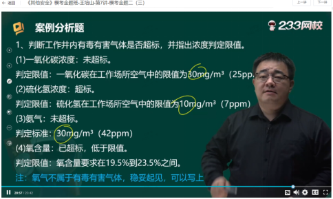 27-1.分析2"污水池内有毒有害气体的主要成分,并给出其最高容许浓度限值和氧气含量(体积分数)安全范围。 | 《其他安全》模考金题班-王培山-第7讲-模考金题二(三) |