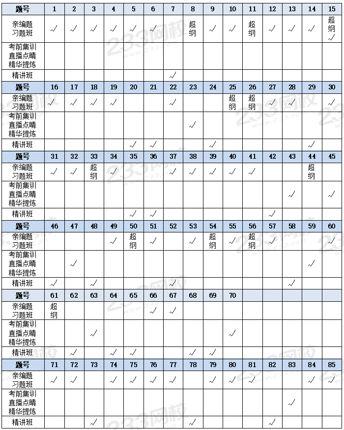 除超纲题之外,所有题目的知识点基本都能在相应的班级课程中找到。亲编题以及习题班所涵盖的知识点对应 58 分,亲编题、习题班、考前集训、直播点睛以及精华提炼所涵盖的知识点对应 66 分,若再加上精讲班,则知识点可基本覆盖除超纲题外的题目。