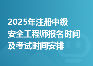 2025年注册中级安全工程师报名时间及考试时间安排已发布,报名将在7月23日-8月13日启动,考试日期为10月25日-26日。插入模块一、报名时间安排中国人事考试网发布《2025年度专业技术人员职业资格考试重要提示》,2025年中级注册安全工程师报名时间为7月23日-8月13日。各地区报考时间有所不同,以当地考试组织机构通知为准。注安报名周期不长,一般在8-12天左右。【各省2025年中级注册安全工程师报名时间>>点击查看】温馨提示:中级注册安全工程师考试报名仅一次机会,无补报名!大查看更多>