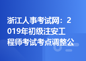 浙江省人事考试院发布:关于2019年度初级注册安全工程师职业资格考试考点调整的公告2019年度初级注册安全工程师职业资格考试,由于全省报考确认的人数只有2555人,根据省应急管理厅等4部门联合印发的《浙江省初级注册安全工程师职业资格考试暂行办法》(浙应急人事〔2019〕91号)第八条“考点设在设区市的大中专院校或者高考定点学校,若应试人员数量较少时可统一设在杭州主城区”的规定,并经省人力社保厅和省应急管理厅相关考试业务主管部门同意,现决定将原定在各市设置考点的计划,统一调整至在杭州市区设置,具体查看更多>