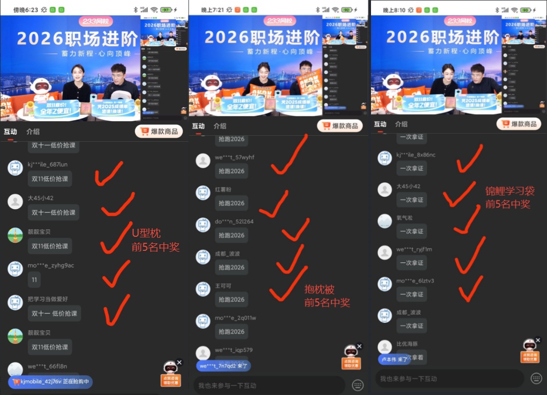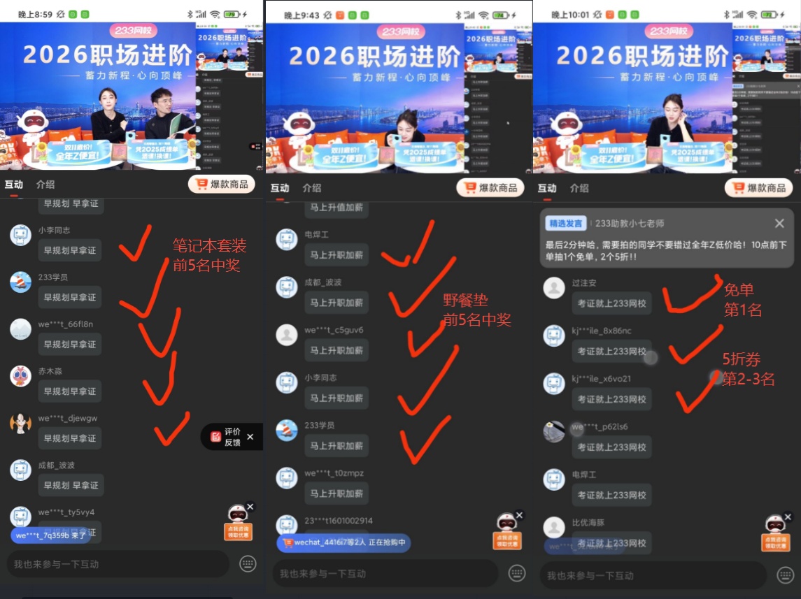 我们还为大家准备了丰富的互动环节,让现场气氛高潮迭起。而最令人激动的莫过于抽奖环节,我们为幸运儿们准备了免单大奖、233网校周边产品——抱枕被、野餐垫、U型枕、锦鲤学习袋、笔记本套装等丰厚奖品。现在,让我们揭晓这些幸运儿们的名单!