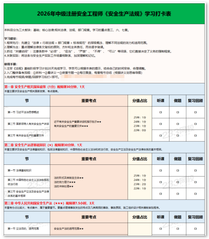为帮你高效执行计划,整理了《注安公共科目30天学习打卡表》,涵盖各章学习建议、考点提示和完成跟踪,按表执行更有方向!