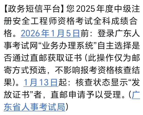 广东的考生已收到短信通知,广东2025年中级注册安全工程师证书直邮申请入口已开通,2026年1月5日前:登录广东人事考试网“业务办理系统”自主选择是否通过直邮获取证书(此操作仅为邮寄方式预选,不影响报考资格核查结果)。1月13日起:核查状态显示“发放证书”者,直邮申请予以受理。