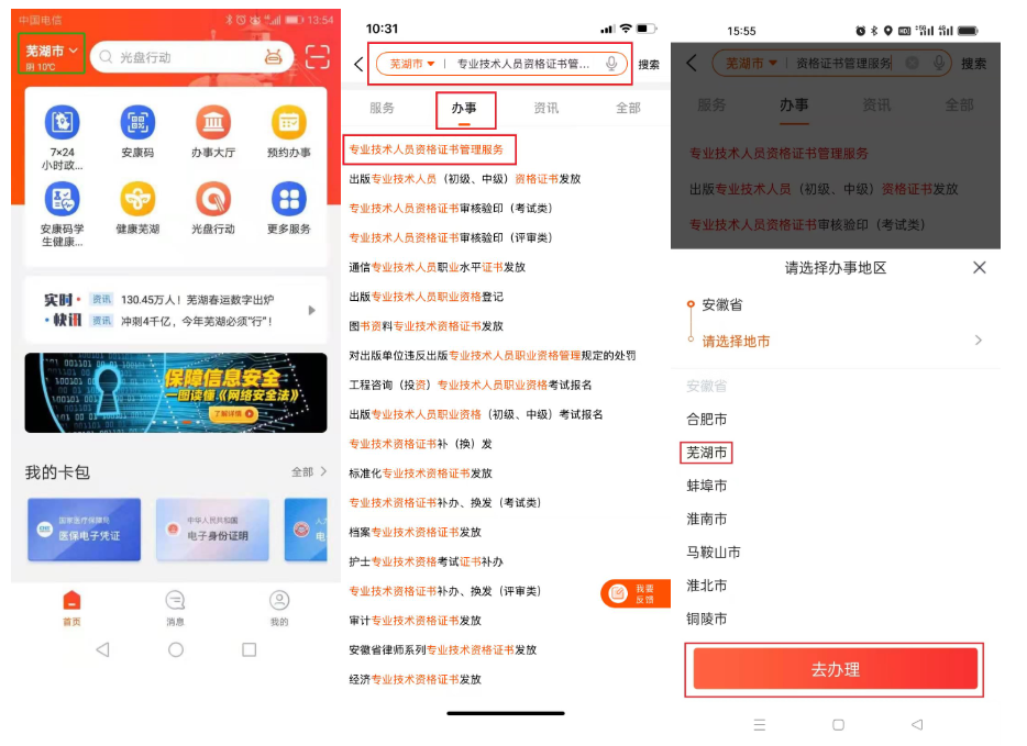 咨询电话:0553—3991199邮寄方式:方式1:移动端申请(推荐使用),手机下载皖事通APP,城市选择芜湖,搜索栏搜索“专业技术人员资格证书管理服务”,在线办理。