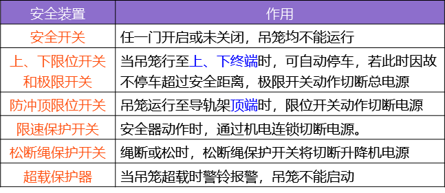 安全装置。安全装置由各种安全开关及其他控制件组成。吊笼上装有上、下限位开关和极限开关,当吊笼行至上、下终端时,可自动停车,若此时因故不停车超过安全距离,极限开关动作切断总电源,使吊笼制动。