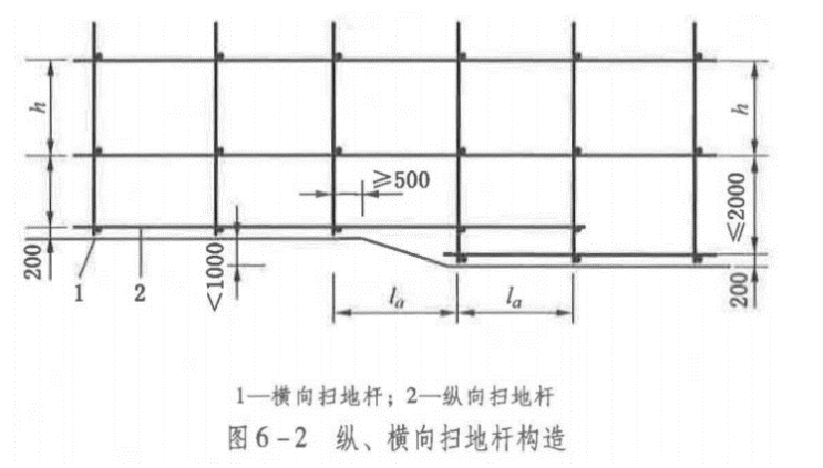 ①脚手架必须设置纵、横向扫地杆。纵向扫地杆应采用直角扣件固定在距底座上皮不大于200mm处的立杆上。