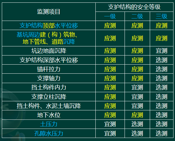 2、某基坑工程支护结构安全等级为二级,施工单位对基坑进行了过程监测。根据《建筑基坑支护技术规程》(JGJ 120),下列基坑监测项目中,属于应测项目的是( )。