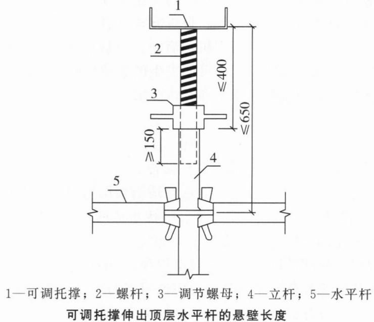 选项C、D符合规定,支撑架可调托撑伸出顶层水平杆或双槽托梁中心线的悬臂长度不应超过650mm,且丝杆外露长度不应超过400mm,可调托撑插入立杆或双槽托梁长度不得小于150mm,可调托撑伸出顶层水平杆的悬壁长度如下图所示。