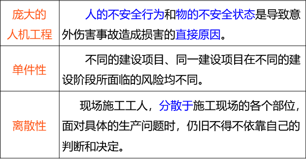 必须不断适应一直变化的人一机一环境系统,并且对自己的施工行为作出决定,从而增加了建筑业生产过程中由于工作人员采取不安全行为或者工作环境的不安全因素导致事故的风险。