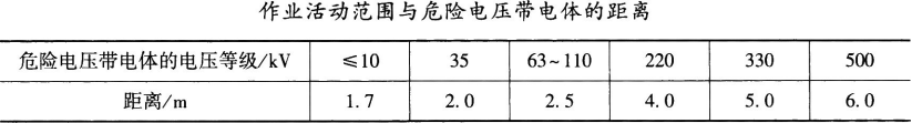 (7)作业活动范围与危险电压带电体距离小于下表的规定。
