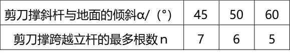 答案解析: 斜杆与地面的倾角应在45°~60°之间,剪刀撑跨越立杆的根数见下表: