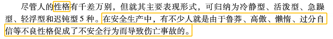 2. 性格:不同的性格特征对安全行为有不同的影响。外向型员工可能更善于沟通和协作,而内向型员工可能更细心和谨慎。管理者应根据员工的性格特点进行合理安排和管理,发挥各自的优势。例如,将细心的员工安排在需要高度专注的工作岗位上,将善于沟通的员工安排在团队协作任务中。