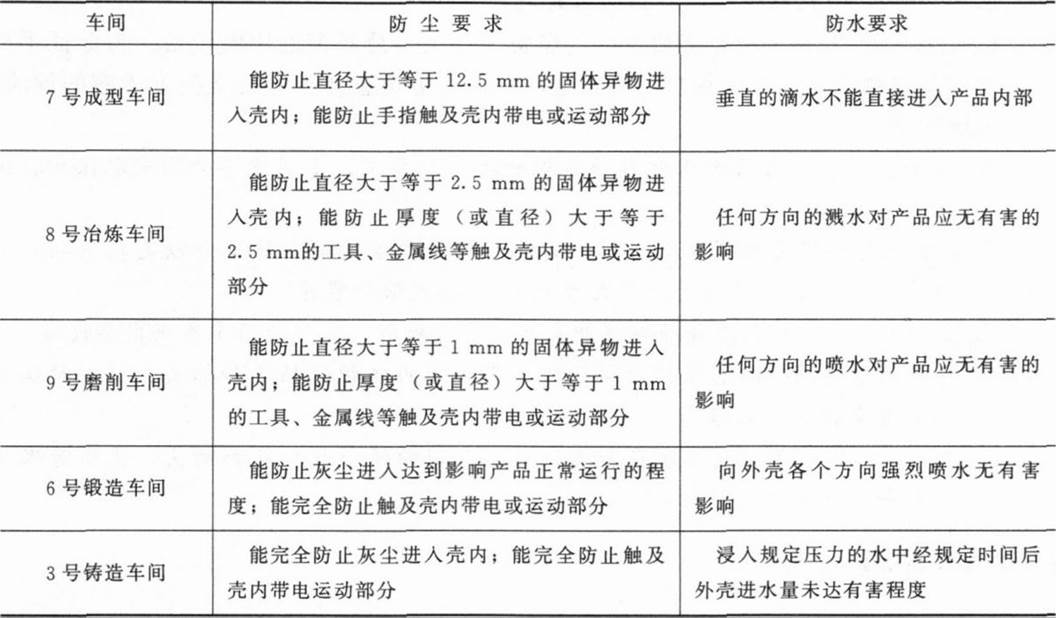 4、 某工厂为减少电气事故,拟购买一批符合相关要求的电气设备,五个车间对设备外壳的要求见下表。下列描述中符合对应安全要求的是( )。