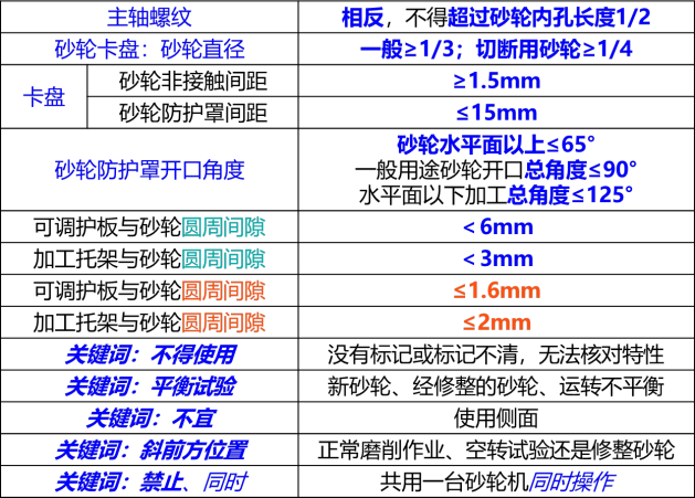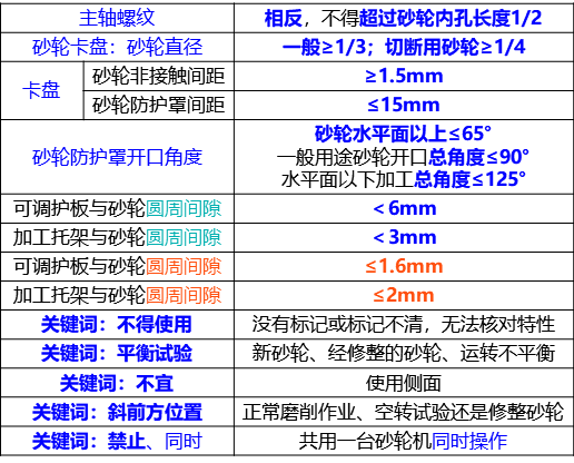 一般用途的砂轮卡盘直径不得小于砂轮直径的1/3,切断用砂轮的卡盘直径不得小于砂轮直径的1/4;卡盘结构应均匀平衡,各表面平滑无锐棱,夹紧装配后,与砂轮接触的环形压紧面应平整、不得翘曲;卡盘与砂轮侧面的非接触部分应有不小于1.5mm的间隙。