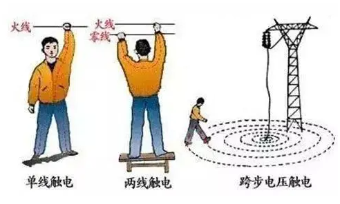 按照人体触及带电体的方式和电流流过人体的途径,电击可分为单线电击、两线电击和跨步电压电击。
