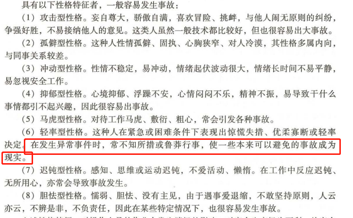 冲动型性格。易冲动,忽视安全工作。
