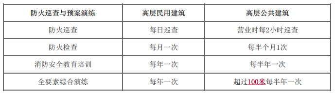 高层民用建筑应当每年至少进行一次全要素综合演练,建筑高度超过100米的高层公共建筑应当每半年至 少进行一次全要素综合演练。编制分预案的,有关单位和职能部门应当每季度至少进行一次综合演练或 者专项灭火、疏散演练。