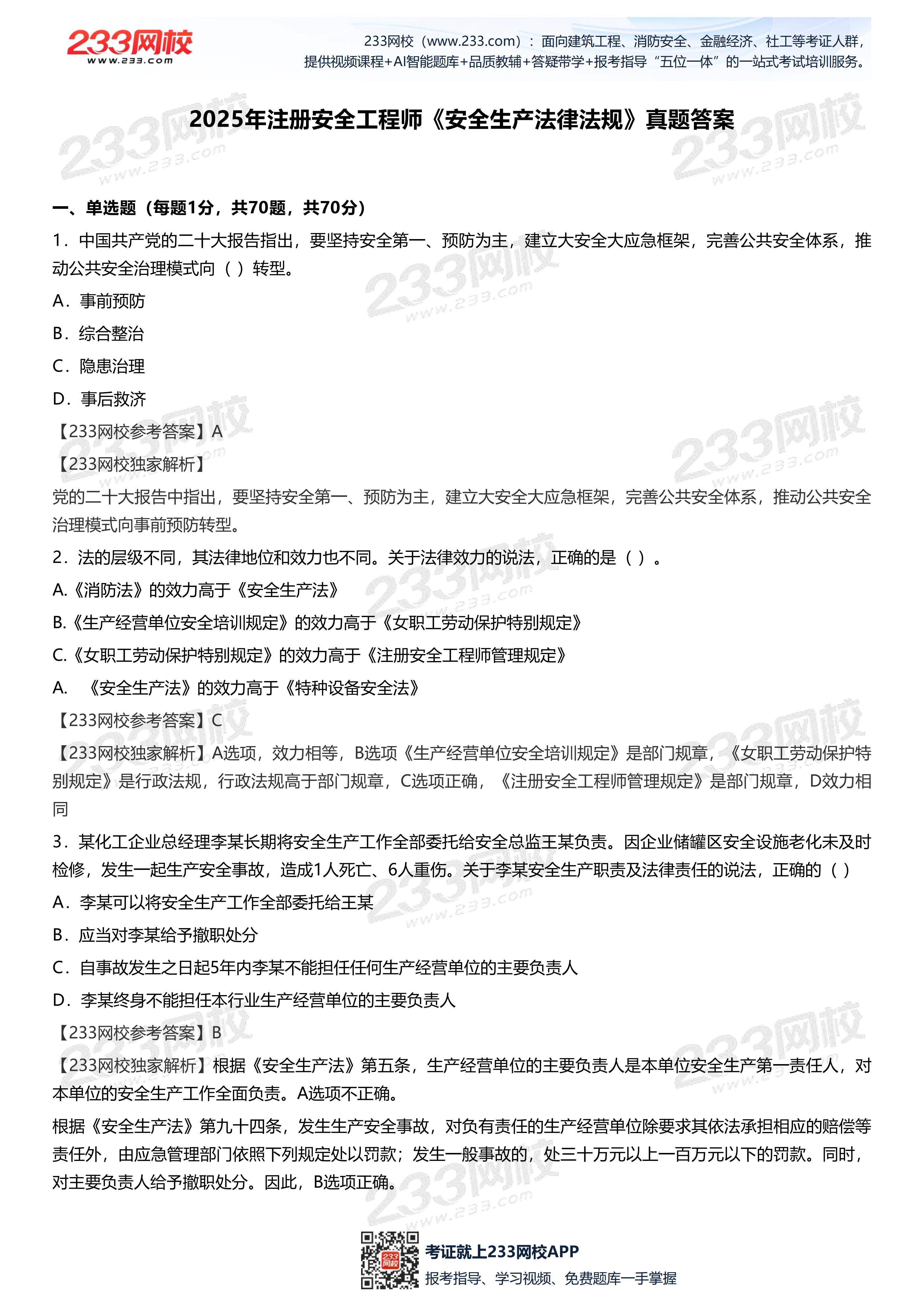 考试结束后,233网校会及时更新2025年安全生产法律法规试题及答案!大家可下方扫码进入小程序快速估分,及时知晓成绩!同时,233网校也预祝大家顺利突破及格线!