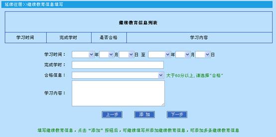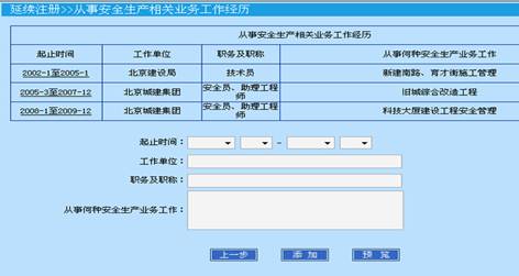 工作经历信息录入后,点击“添加”即可,一次注册可添加多条工作经历信息。对应已添加的工作经历,可点击列表中的“起止时间”进行修改和删除,如图34。
