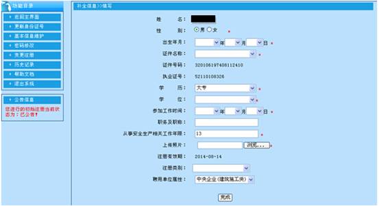 若注册用户注册类别和单位属性等信息不全,或者已获取执业证书的用户首次登陆,应进行补全信息的填写,如图55。