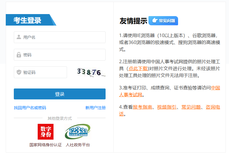 需要提醒考生的是,报名时必须使用18位号码的第二代居民身份证,考试时携带的身份证号码必须与报名时的身份证号码一致。此外,持有效期内的临时身份证可以参加考试,不可以持护照和驾驶证参加考试。
