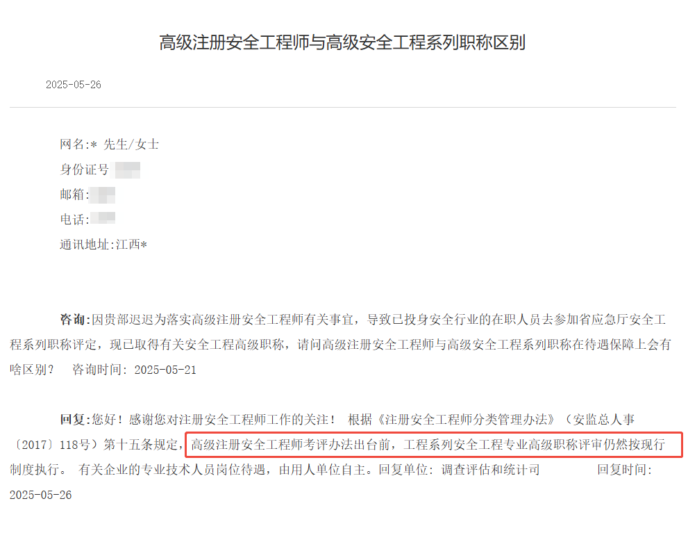 咨询:因贵部迟迟为落实高级注册安全工程师有关事宜,导致已投身安全行业的在职人员去参加省应急厅安全工程系列职称评定,现已取得有关安全工程高级职称,请问高级注册安全工程师与高级安全工程系列职称在待遇保障上会有啥区别?