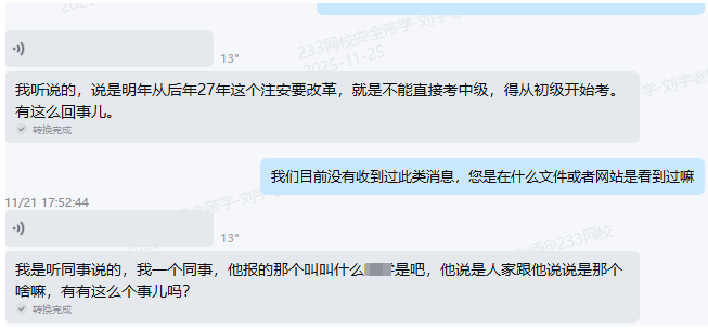 突然收到一位学员的紧急“求助”:“老师,听说明年注安考试改革了,必须像考职称一样,先考过初级,才能报名中级?有这么回事吗?”