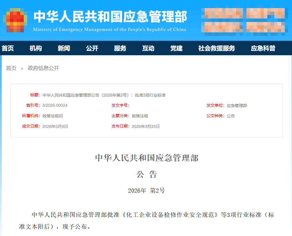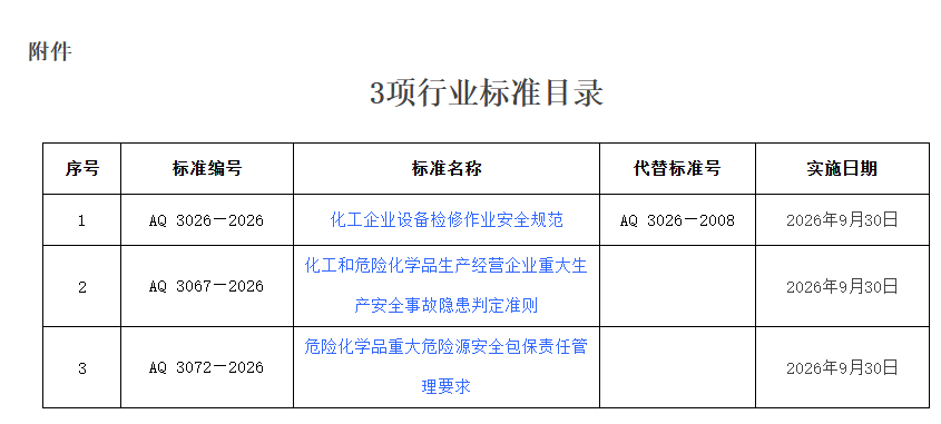 此次发布的3项标准分别是《化工企业设备检修作业安全规范》(AQ3026-2026)、《危险化学品重大危险源安全包保责任管理要求》(AQ3067-2026)和《化工和危险化学品生产经营企业重大生产安全事故隐患判定准则》(AQ3072-2026),均将于2026年9月30日正式实施。