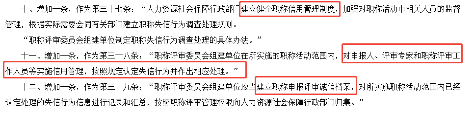此次职称评审制度最大的变化应该是实施信用管理,将申报人、评审专家、工作人员全部纳入信用监管范围,将职称评审中的违规行为上升到信用记录层面。