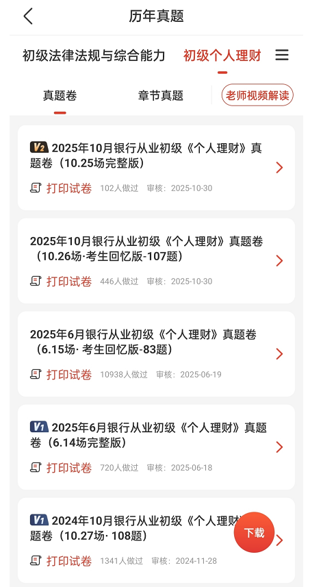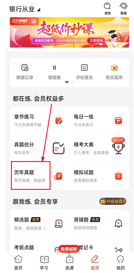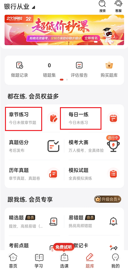 233网校APP银行从业资格证考试题库的【都在练】模块,主要包括有章节练习、每日一练、历年真题、真题估分、模考大赛、模拟试卷,都属于给大家常规备考使用的题库。一般有搭配课程学习的,备考时间充足的,用这几个部分基本够用。