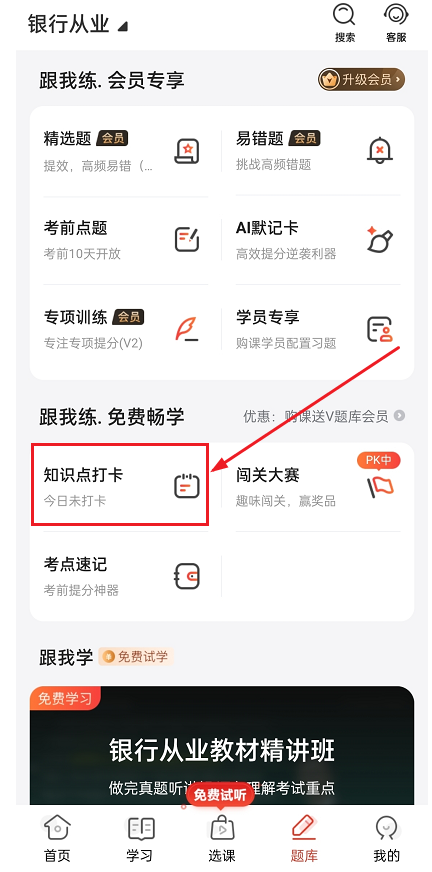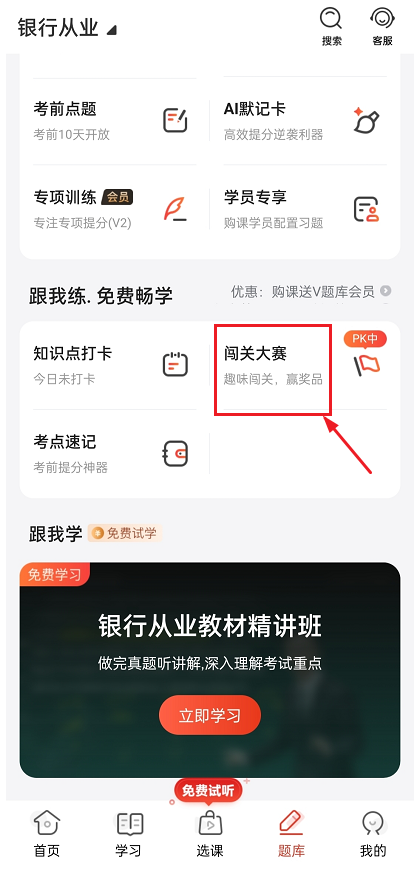 233网校APP银行从业资格证考试题库的【跟我练】模块,主要包括闯关大赛、知识点打卡、考点速记,是对所有人开放的刷题模块,具有一定的趣味性和奖励性质。