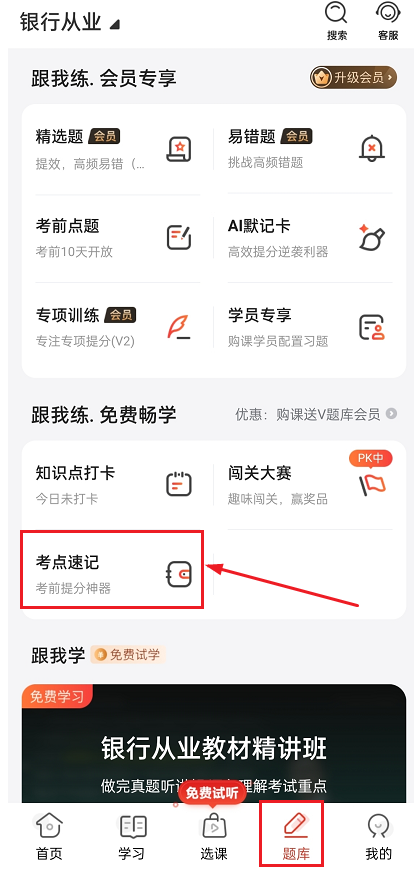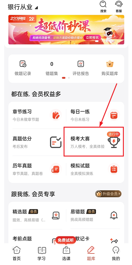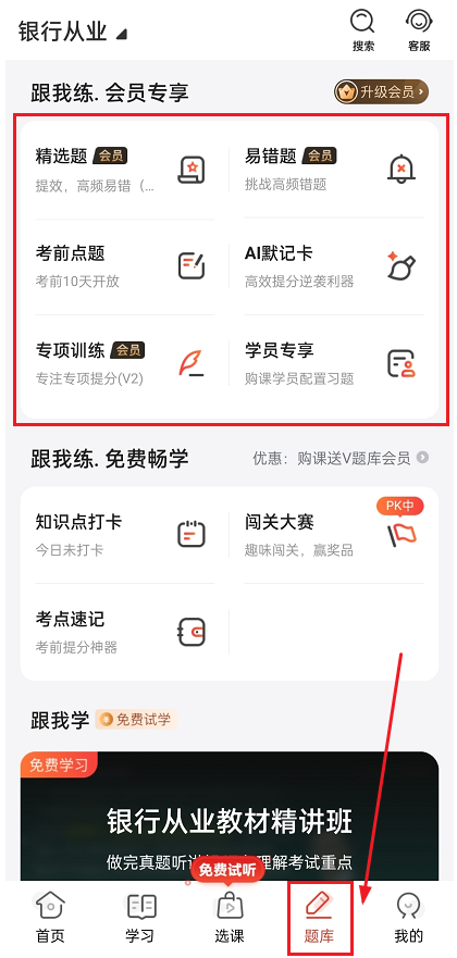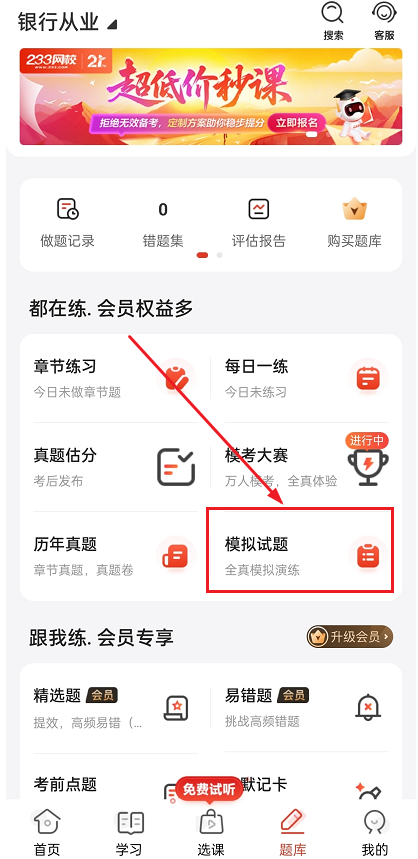 233网校APP银行从业资格证考试题库的【跟我练】模块,主要包括有精选题、易错题、默记卡、考前点题、学员专享,是专门提供给购买了V1和V2题库会员的考生专用(购买课程会赠送V1或V2题库会员权限)。如果学习时间紧迫的,或者考试备考有薄弱的,都可以通过本模考进行特别训练。