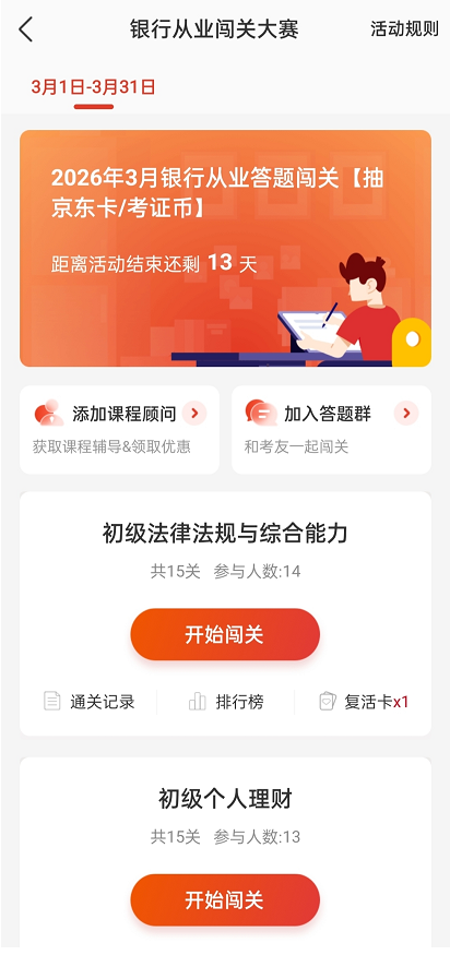 闯关大赛赢京东卡:为了避免学员做题枯燥,我们开发了【答题闯关】的玩法。一共15关,每个关卡10道题,答对60%即闯关成功。不同的关卡设置有不同的奖励在等着你,15关全部通关后,还会有一次额外的抽奖机会!奖品包含50元京东卡、考证币、下载币、题库会员等,赶紧去参加吧!