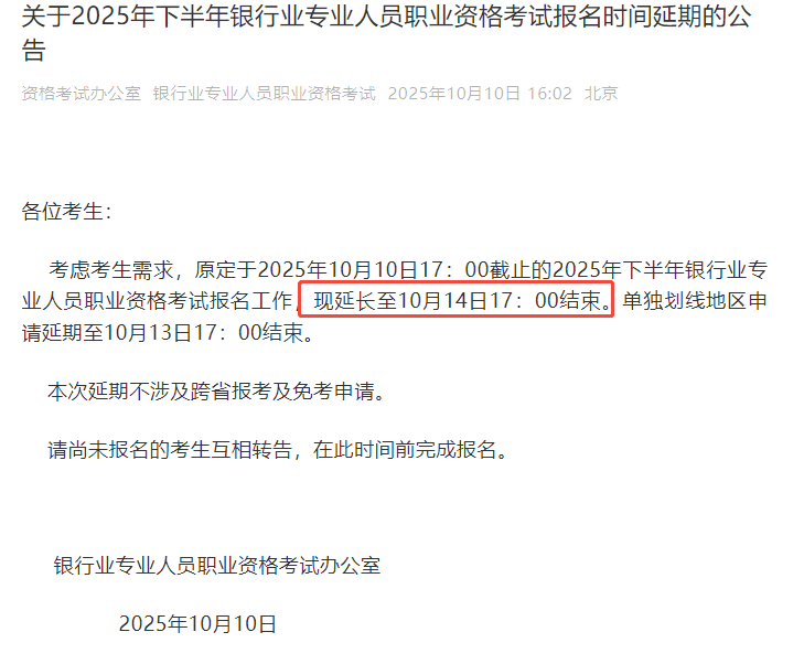 考虑考生需求,原定于2025年10月10日17:00截止的2025年下半年银行业专业人员职业资格考试报名工作,现延长至10月14日17:00结束。单独划线地区申请延期至10月13日17:00结束。