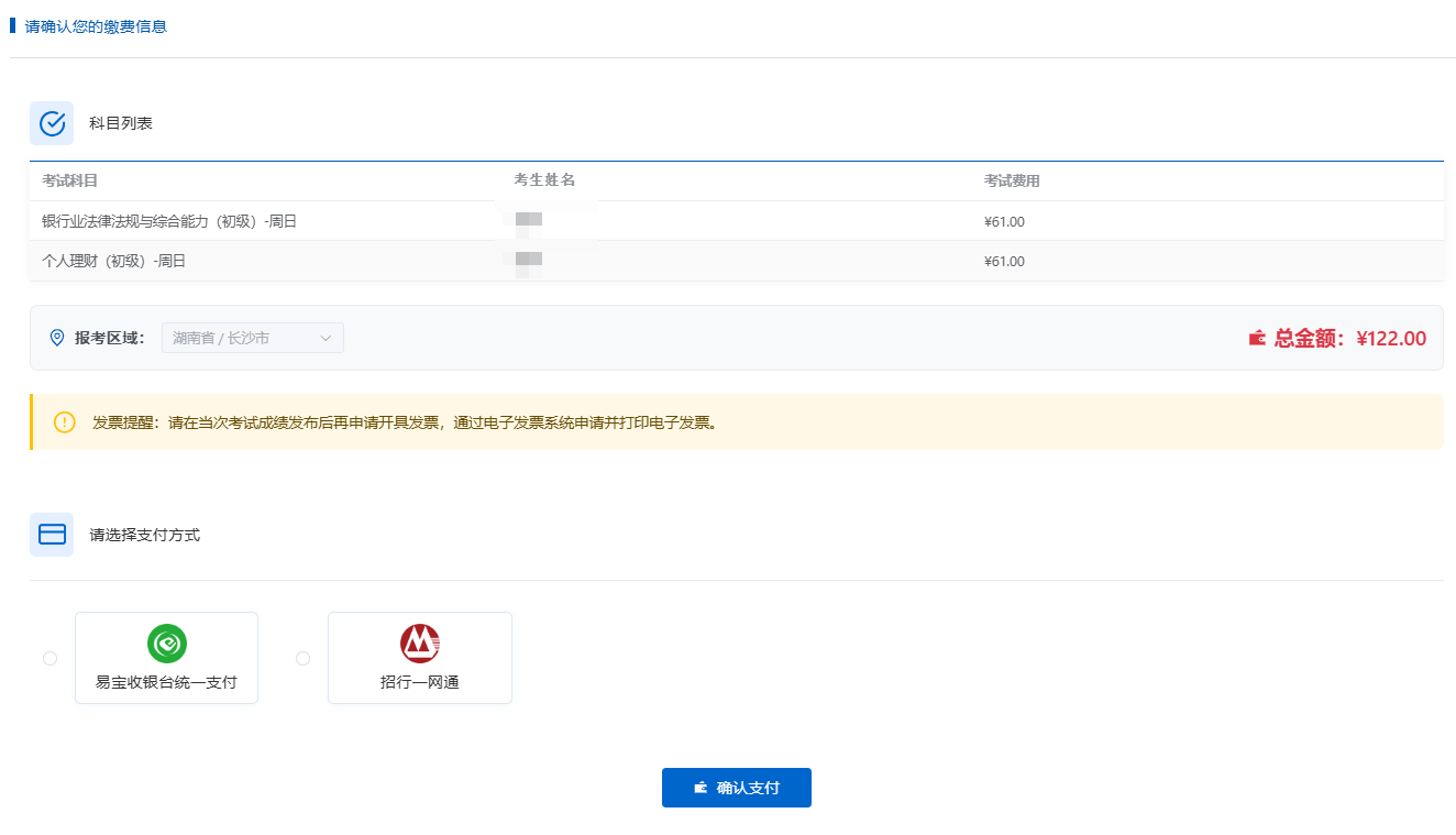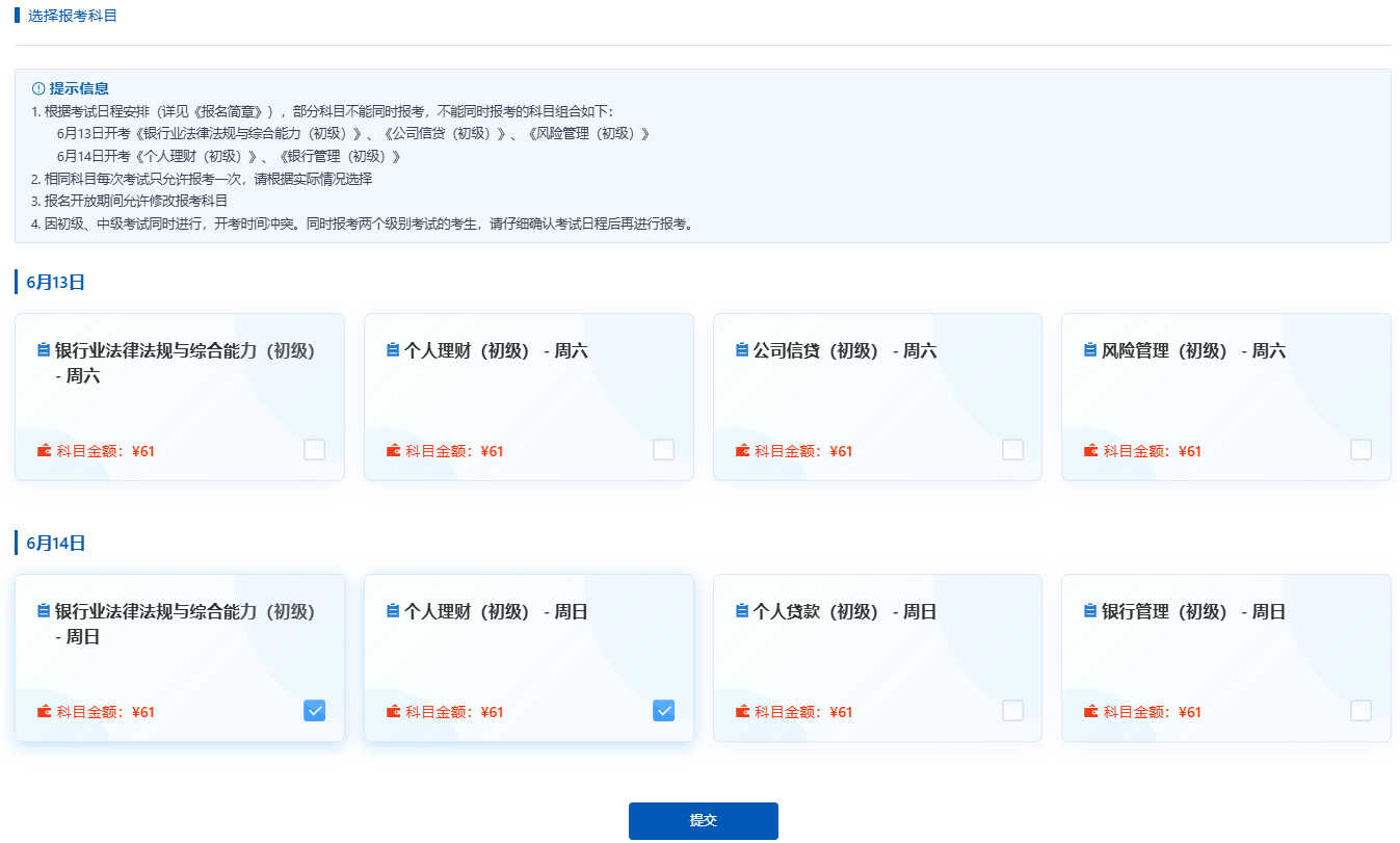 2. 相同科目每次考试只允许报考一次,请根据实际情况选择;